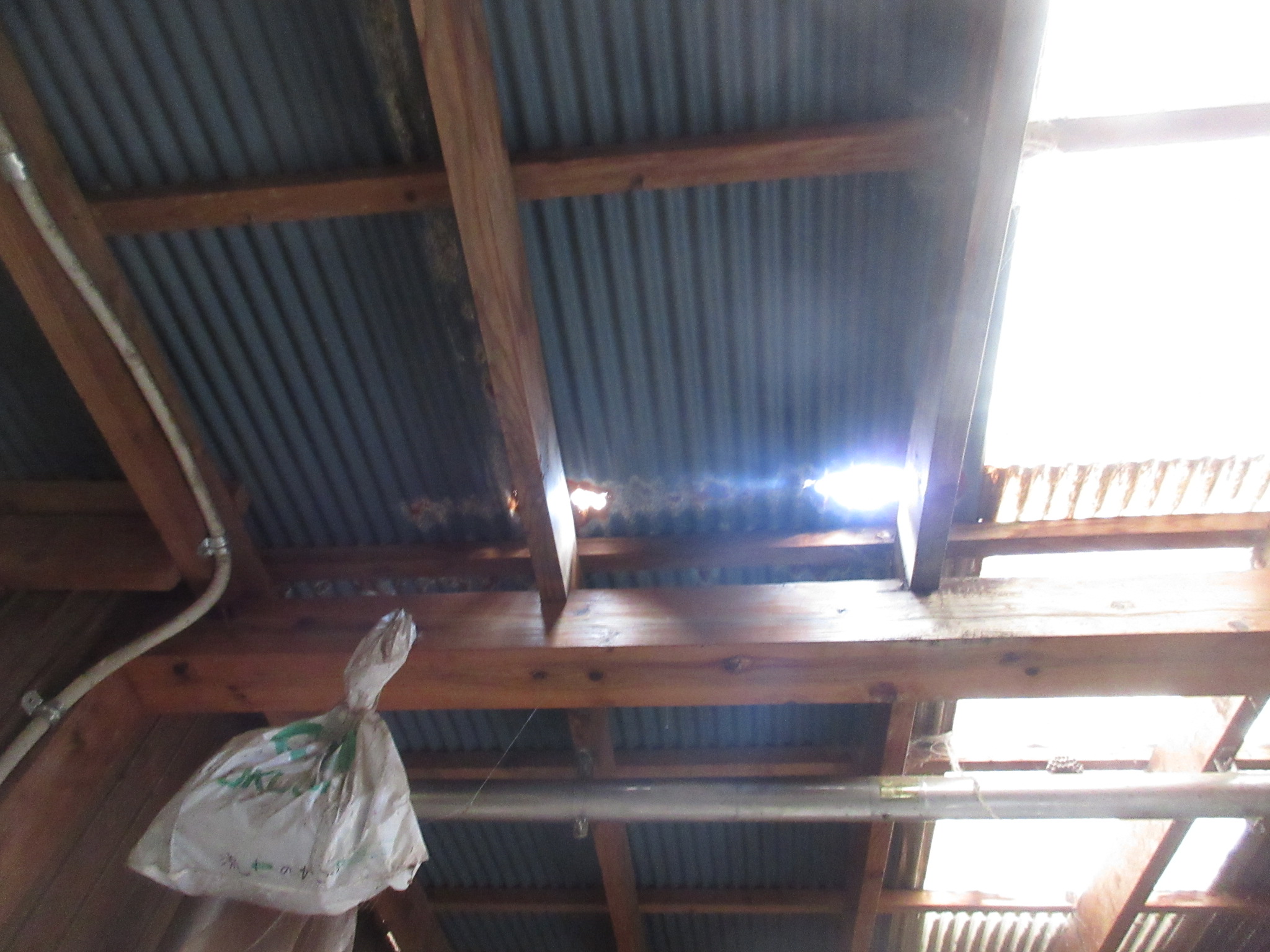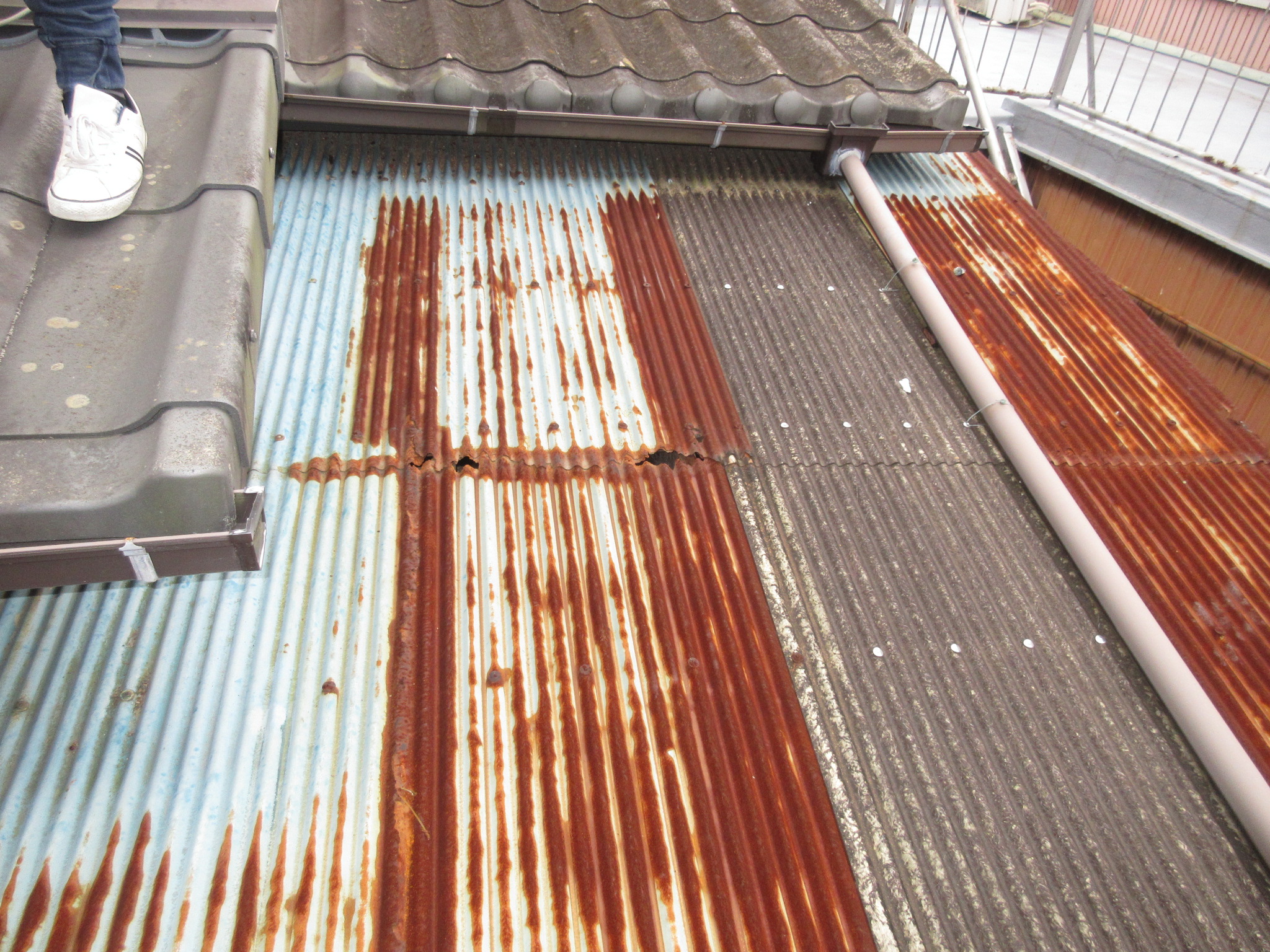 連絡を頂き、現場を確認。経年劣化で金属製の波板トタンが錆びて、穴が開いている状態だったのと